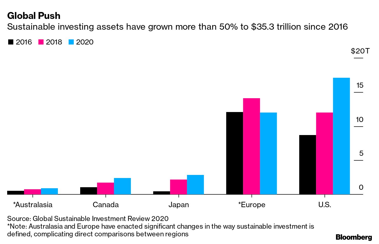 There aren't yet similar requirements in the U.S., so it's uncertain how many true-green ESG funds there really are. At the end of 2020, sustainable assets totaled about $12 trillion (after GSIA's decision) in Europe, compared with closer to $17 trillion in the U.S.
